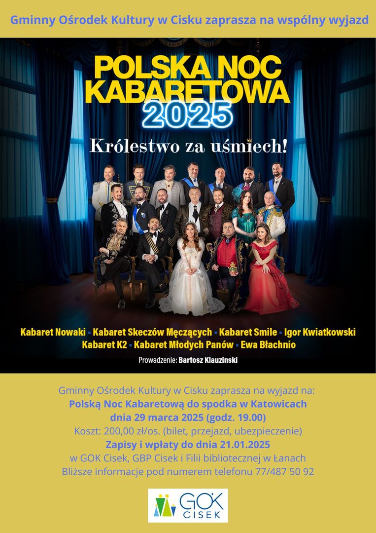 Serdecznie zapraszamy na wspólny wyjazd do katowickiego spodka na Polską Noc Kabaretową z znanymi i lubianymi kabaretami. Szczegóły na plakacie.