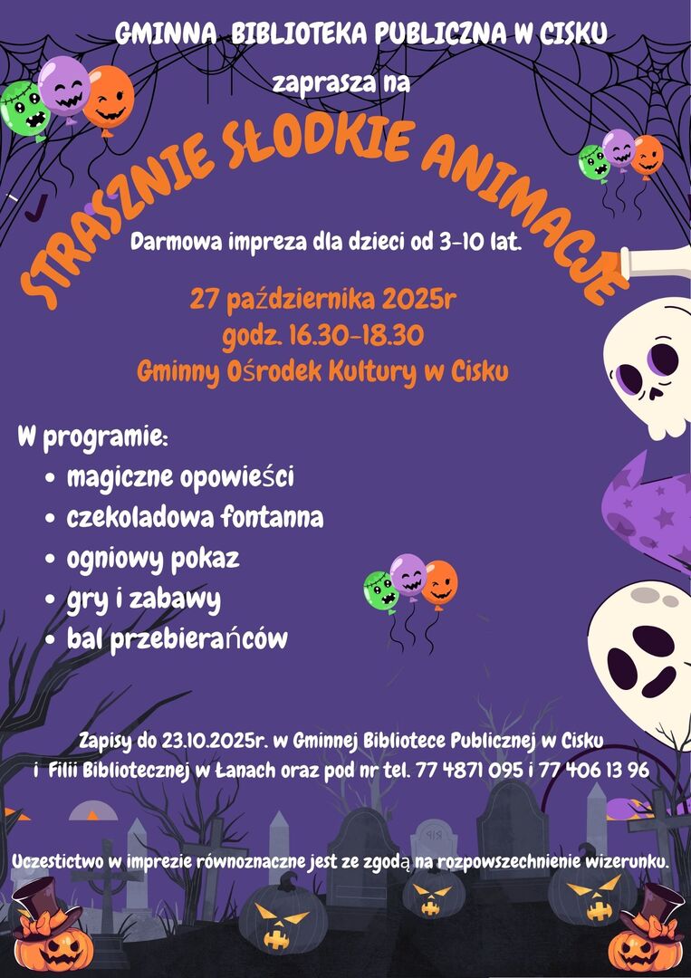 Gminna Biblioteka Publiczna w Cisku serdecznie zaprasza wszystkich najmłodszych miłośników dobrej zabawy na Strasznie słodkie animacje.